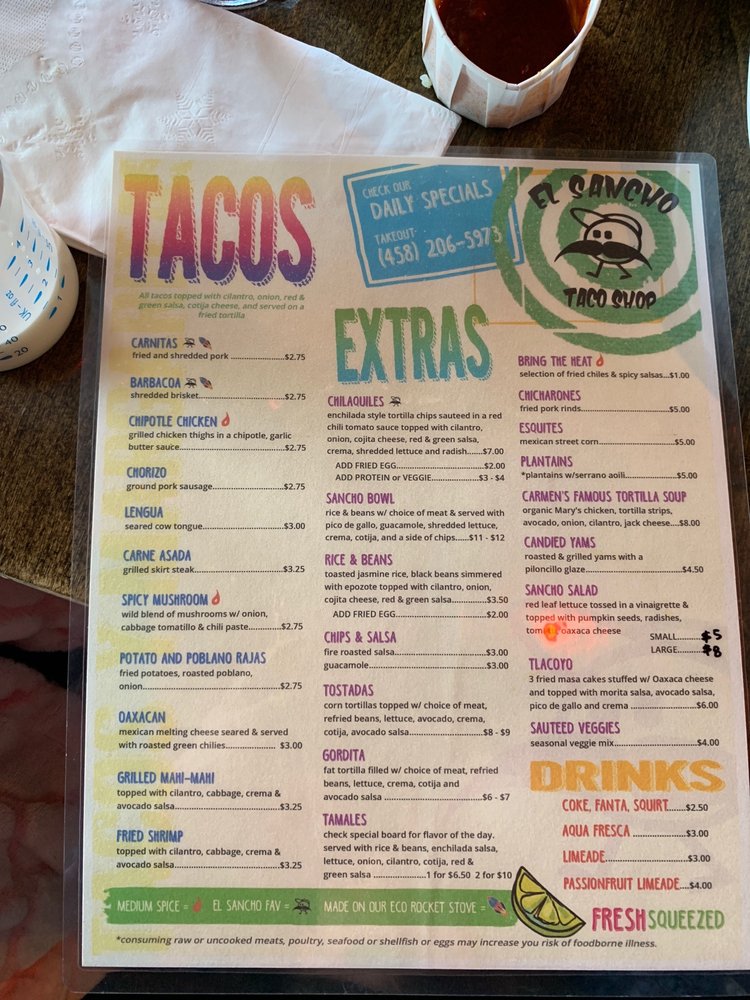 El Sancho - Eastside Taco Shop in Bend, OR offers a vibrant Mexican cuisine experience with a diverse menu. Known for their flavorful tacos, including options like barbacoa, chicken, green chile, shrimp, mahi mahi, and mushroom, there is something for every palate. Customers rave about the perfectly cooked shrimp, unique guacamole, and delicious margaritas. The ordering process is organized, and the staff is friendly and helpful. With options for vegan and vegetarian diets, as well as ample outdoor seating and free Wi-Fi, El Sancho provides a casual and enjoyable dining atmosphere. Whether you're a taco enthusiast or looking to try something new, El Sancho is a must-visit spot for tasty and creative Mexican dishes.